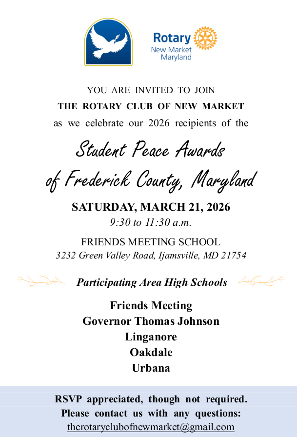 The Student Peace Awards of Frederick County, Maryland honors senior high school students who have made a positive contribution to their school or wider community by promoting mutual understanding and respect for all people. The program is a project of the New Market Rotary Club.